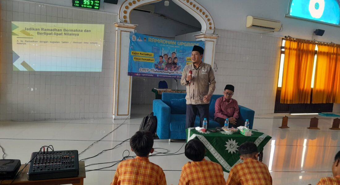 SMP Muhammadiyah 16 Gelar Kajian Tahrib RamadhanSurabaya, Spemnas – Suasana khidmat dan penuh kegembiraan menyelimuti Masjid Al Mukhlis SMP Muhammadiyah 16 Surabaya (Spemnas). Seluruh siswa berkumpul dengan wajah sumringah mengikuti kegiatan Tarhib Ramadhan, sebuah agenda rutin yang digelar untuk membekali siswa secara spiritual dan intelektual menjelang bulan suci, Kamis (12/02/2026)
